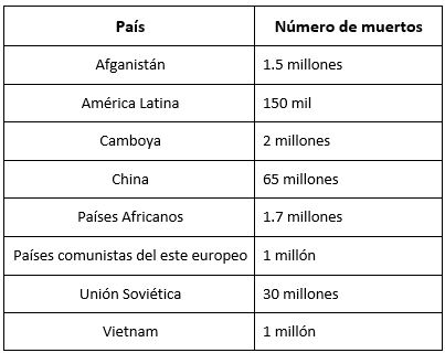 Cuando estudiamos la historia de las revoluciones comunistas, es imposible no sentirnos aterrados por los horrores que los revolucionarios practicaron buscando modificar el sistema económico de sus países. El “Libro Negro del Comunismo” estima que en medio siglo 100 MILLONES de personas han sido asesinadas por las dictaduras totalitarias, incluyendo cristianos de varias denominaciones. El Museum on Communism ha estimado las muertes y las resumimos en esta tabla: