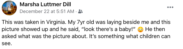 La publicación dice: “Esto fue tomado en Virginia. Mi [hijo de 7 años] estaba acostado a mi lado y apareció esta imagen y dijo: “¡Mira, hay un bebé!”