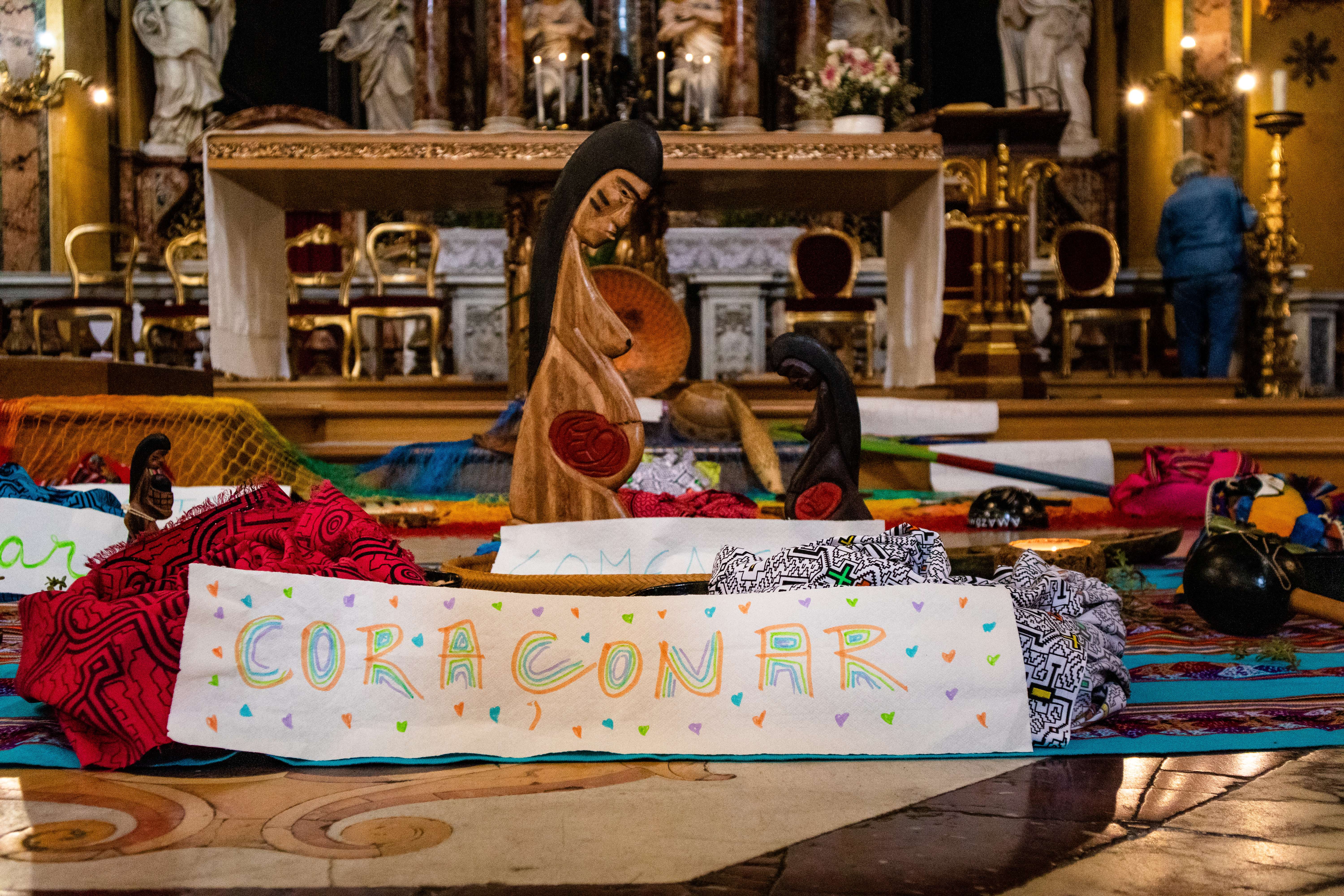 En uno de sus rituales, hecho el 9 de octubre, un grupo del REPAM presentó frente al altar telas de colores y distintos objetos típicos de la amazonía.