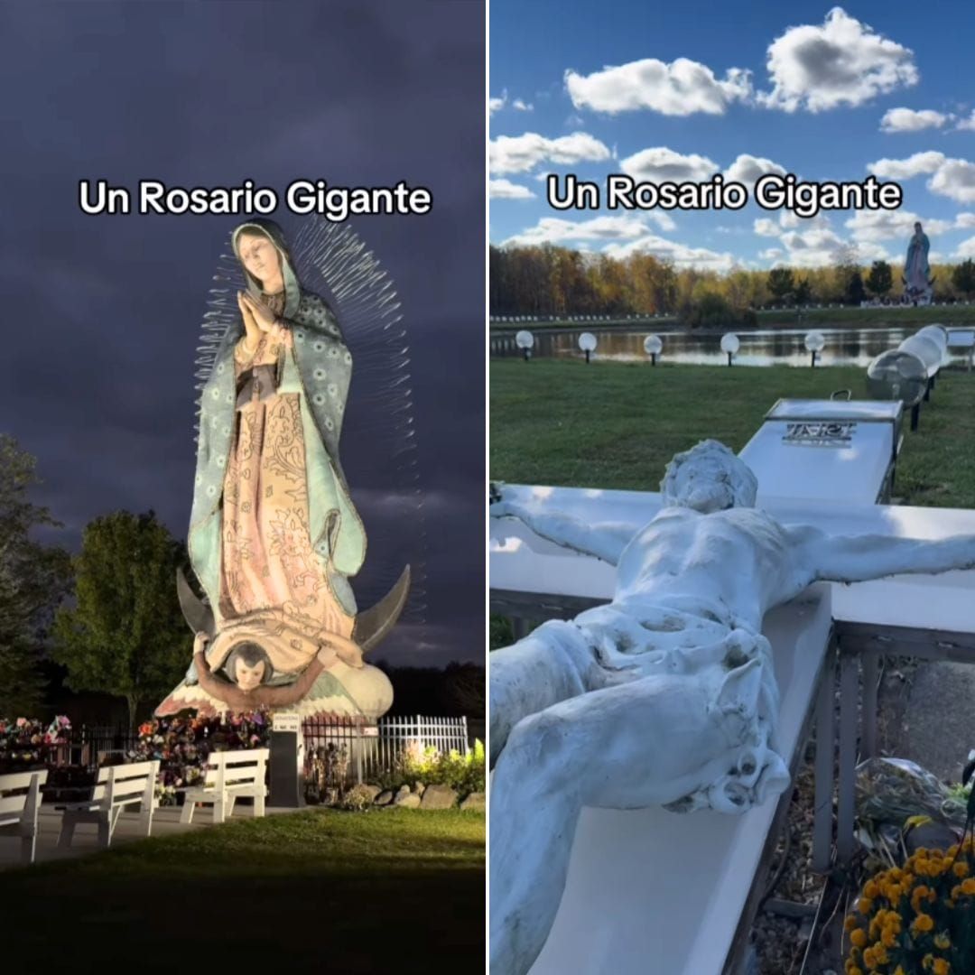 A los pies de la Virgen de Guadalupe, un rosario gigante rodea un pequeño lago y guía a los fieles en oración.