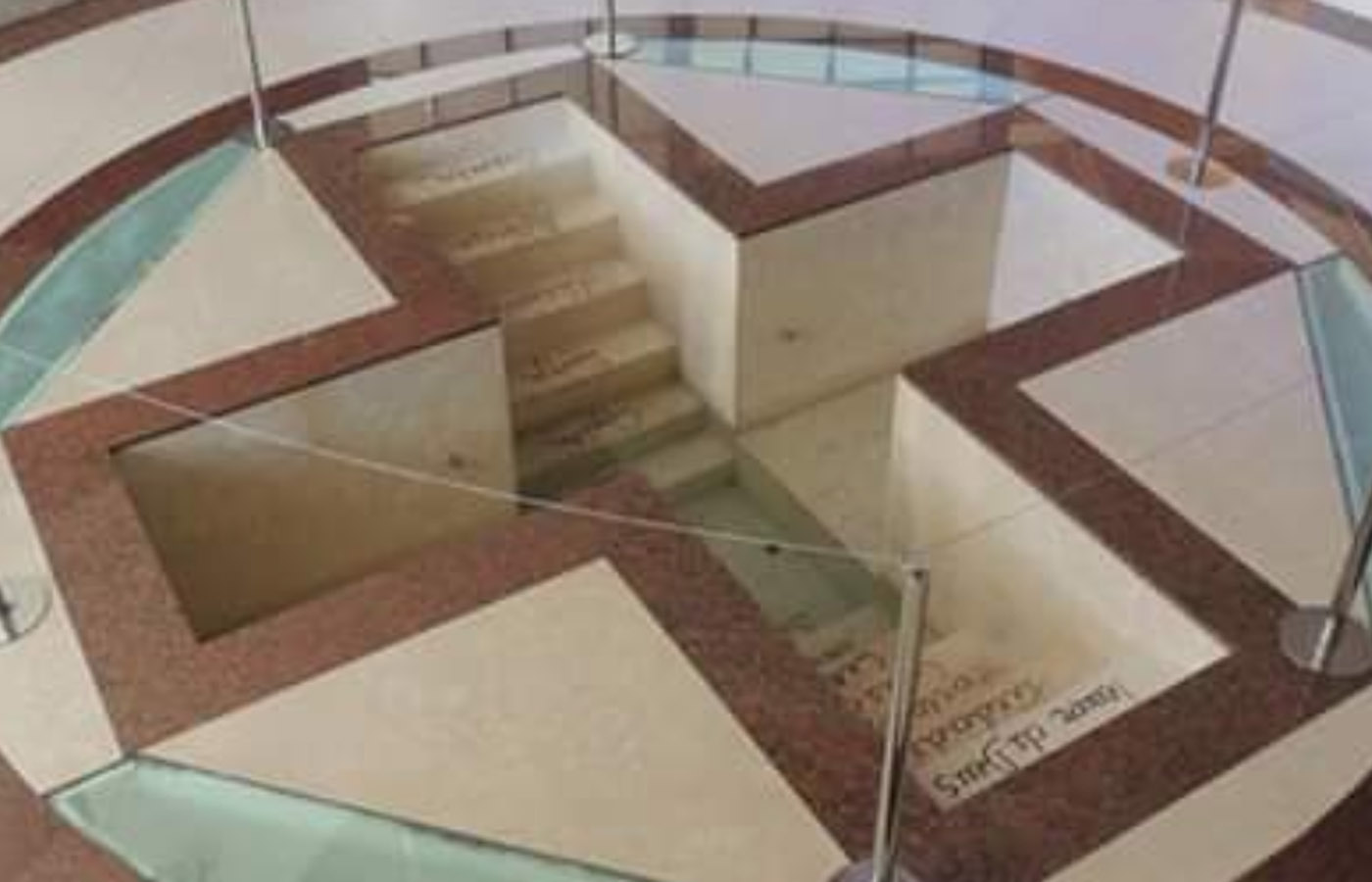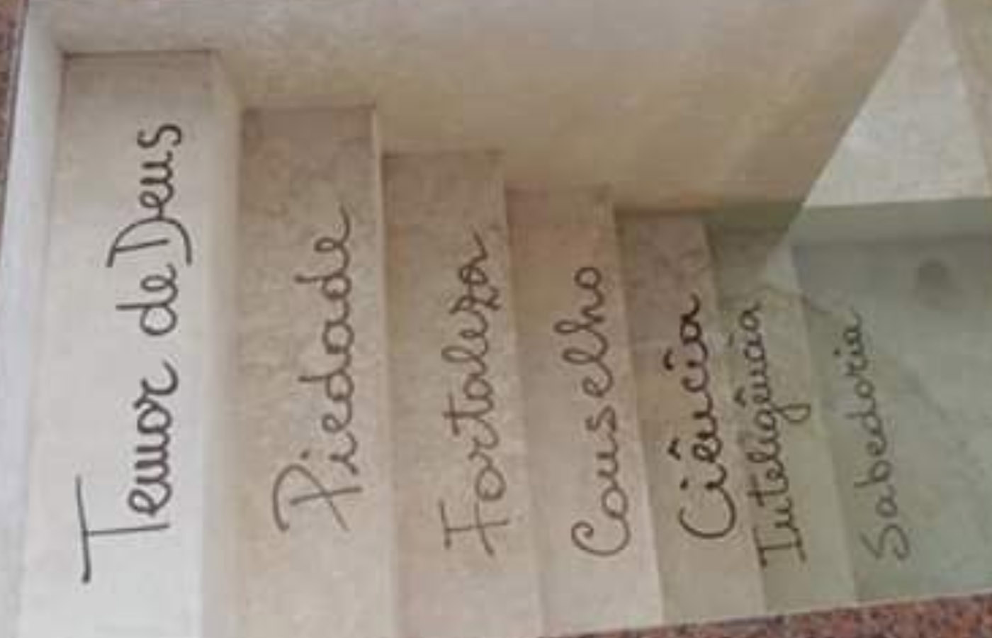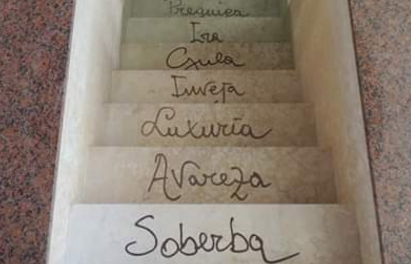 En cada escalón de entrada, está grabada un pecado capital. Esto simboliza que, al entrar al bautismo, estás dejando atrás todos estos pecados, las obras del demonio.