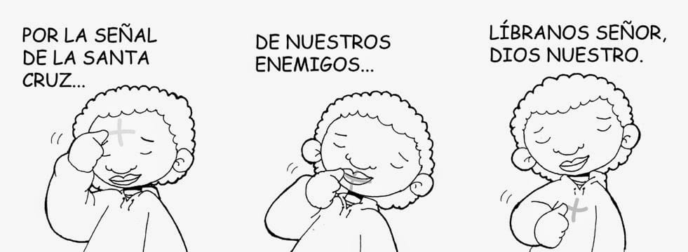 Consiste en dibujar tres cruces sobre nuestro cuerpo; sobre la frente, nuestra boca o nuestro pecho. Para debemos formar una cruz con el dedo pulgar e índice y rezar lo siguiente: “Por la señal de la Santa Cruz (cruz sobre la frente), de nuestros enemigos (cruz sobre la boca), líbranos Señor Dios nuestro (cruz sobre el pecho)".