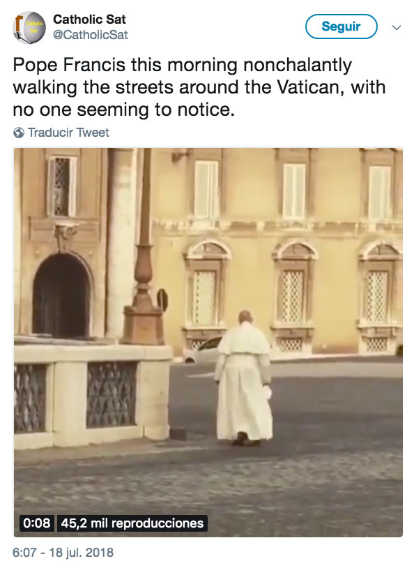 La cuenta @CatholicSat difundió el video en Twitter, donde obtuvo más de 50 mil reproducciones, con este texto: “el Papa estaba caminando esta mañana (18 de julio) despreocupado por las calles alrededor del Vaticano sin que nadie lo note”.