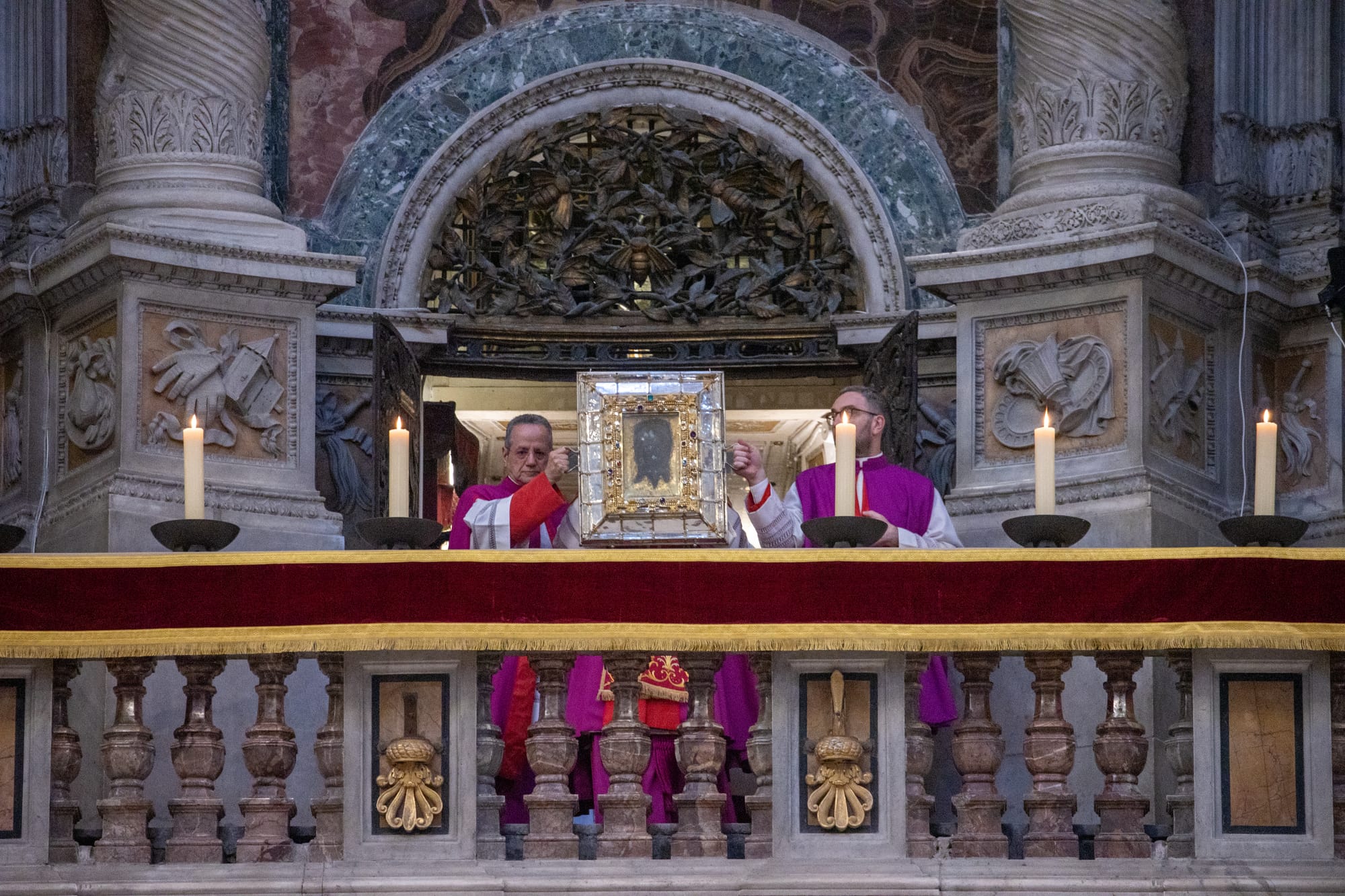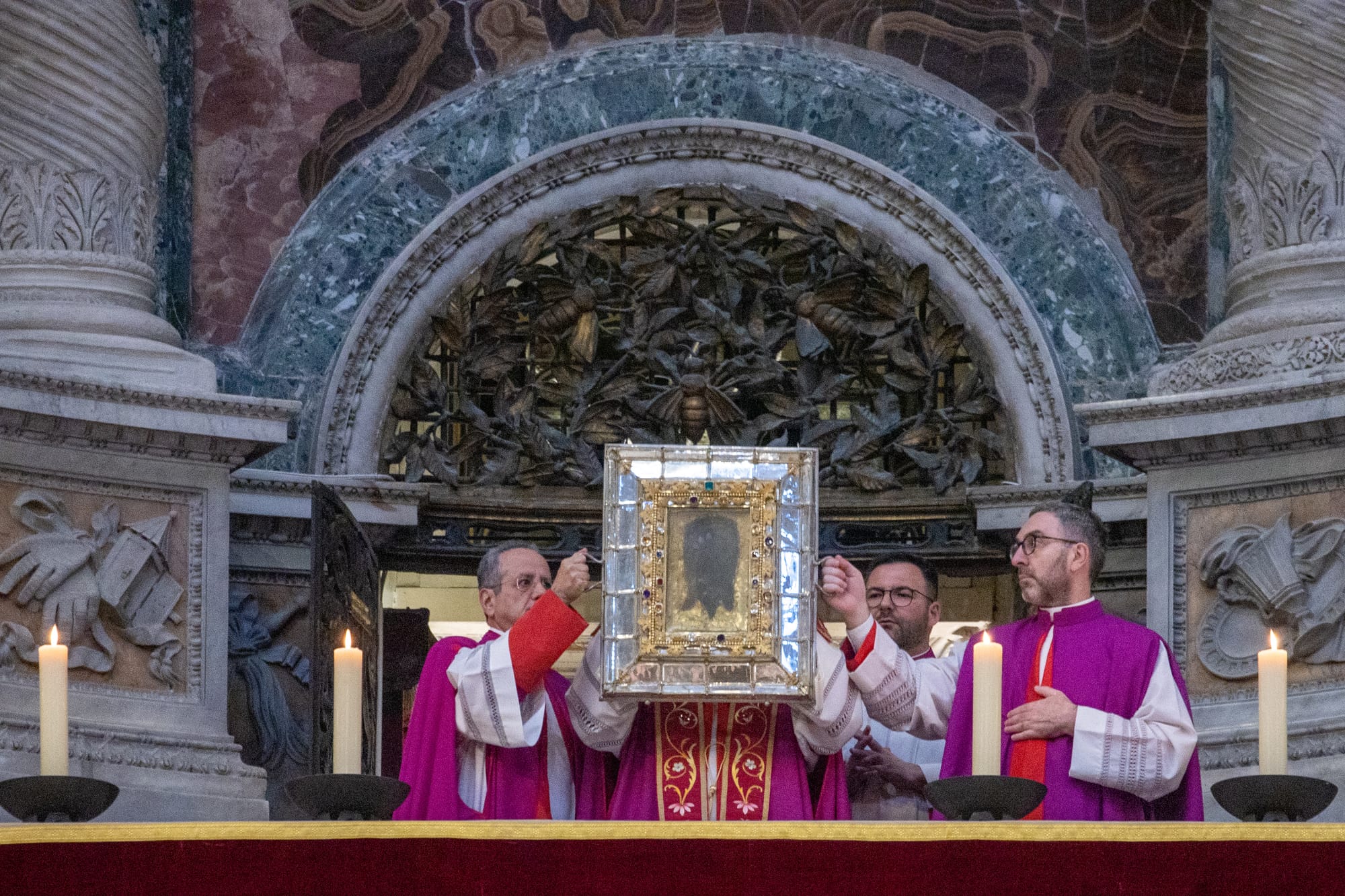 Para acomodar a la creciente multitud de peregrinos jubilares, la procesión concluye con la exposición de la reliquia del Santo Rostro en el velo de Verónica.