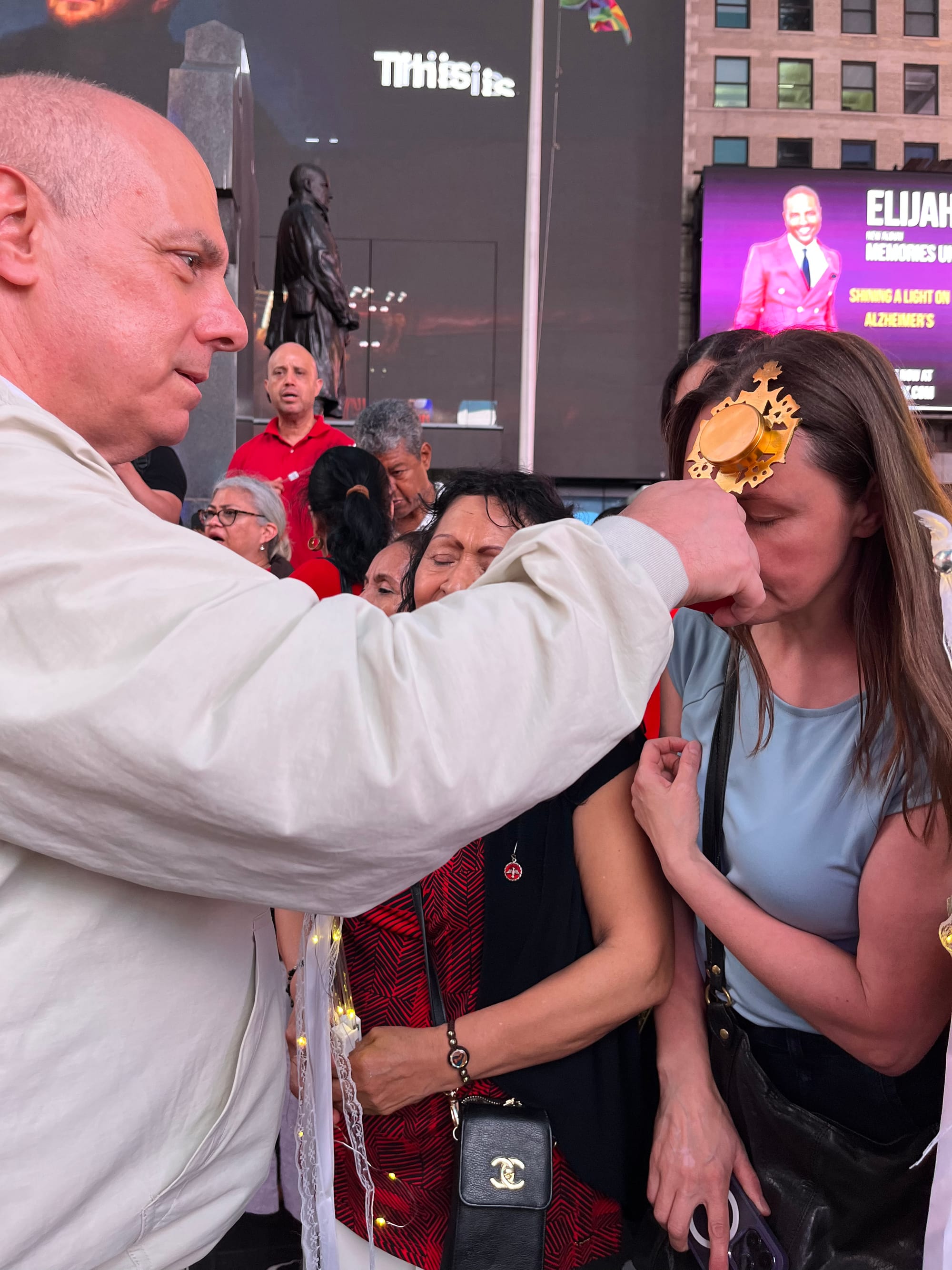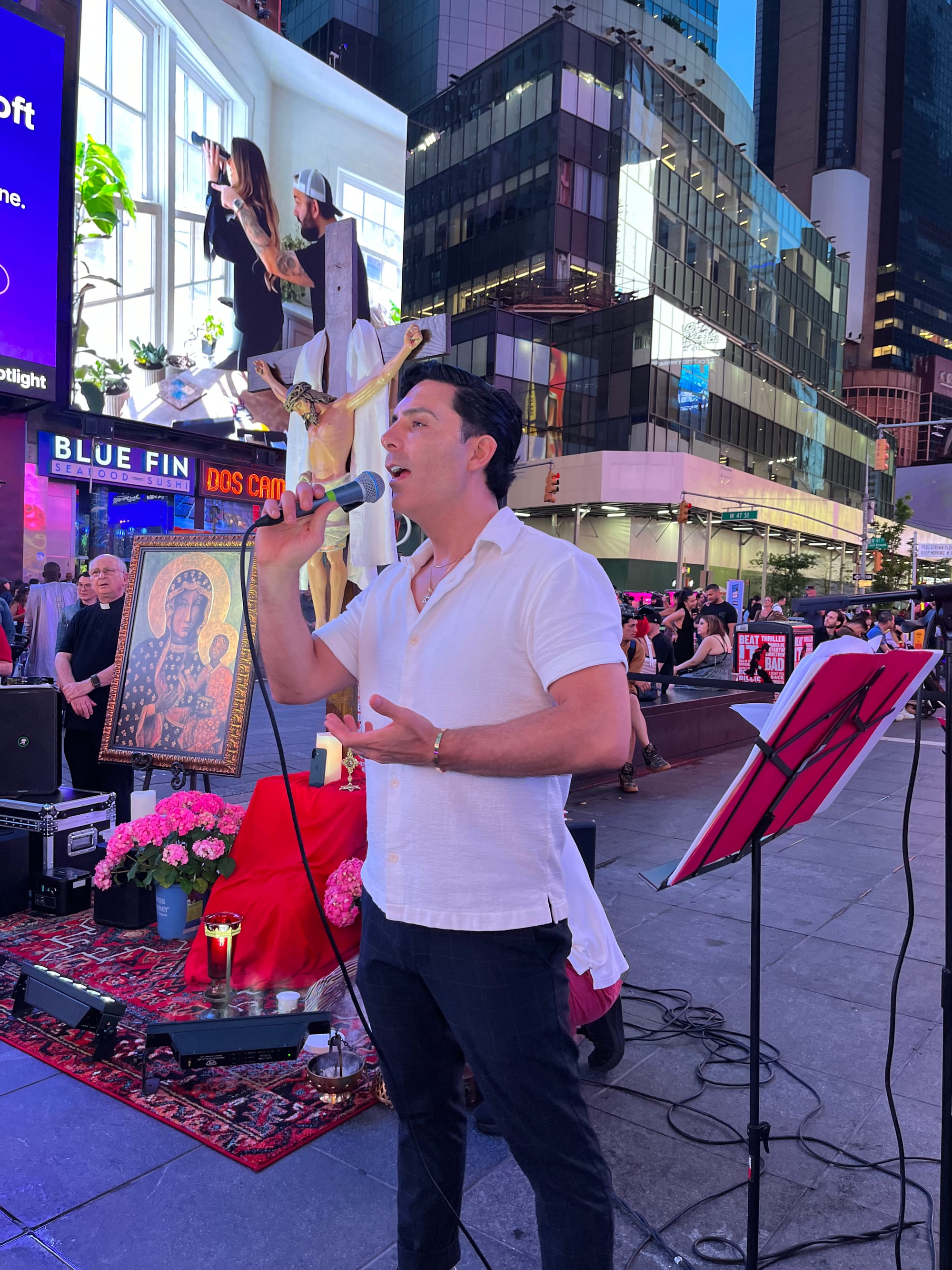 Fieles cantando en Times Square. Crédito: Juan Camilo Pérez