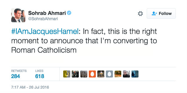 En su Twitter se lee “#IAmJacquesHamel: De hecho, este es el momento correcto para anunciar mi conversión al Catolicismo Romano”.