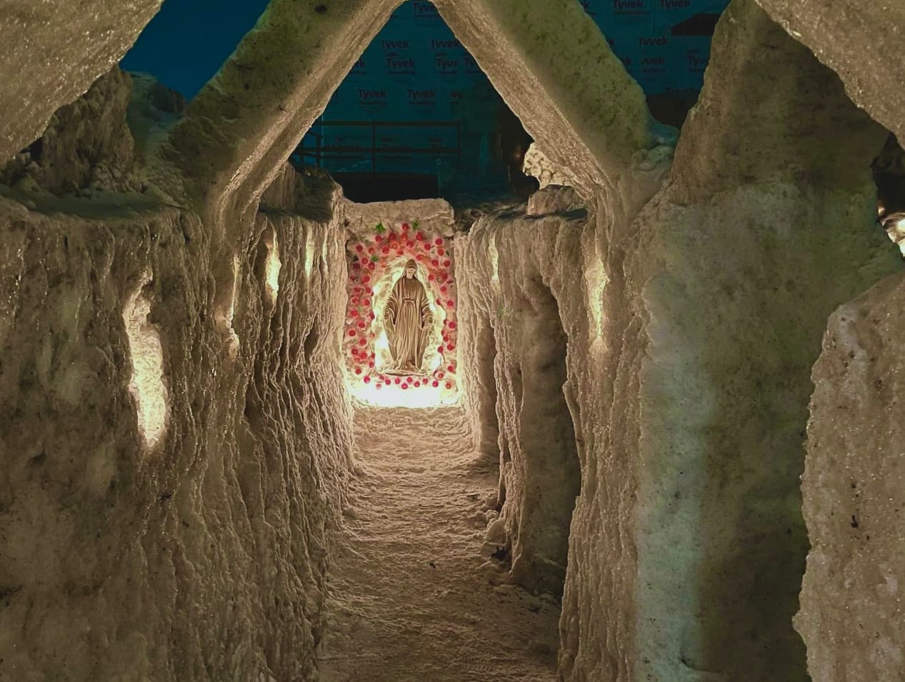 Esta fue una manera en que la parroquia aprovechó los más de 50 centímetros de nieve que caen cada año en San Alberto y brindó a los estudiantes de la universidad la oportunidad de desarrollar sus habilidades de ingeniería de forma creativa. Tras recibir el permiso del obispo local, el párroco, el padre Ben Hasse, dirigió a la comunidad en la construcción de este encantador recinto.