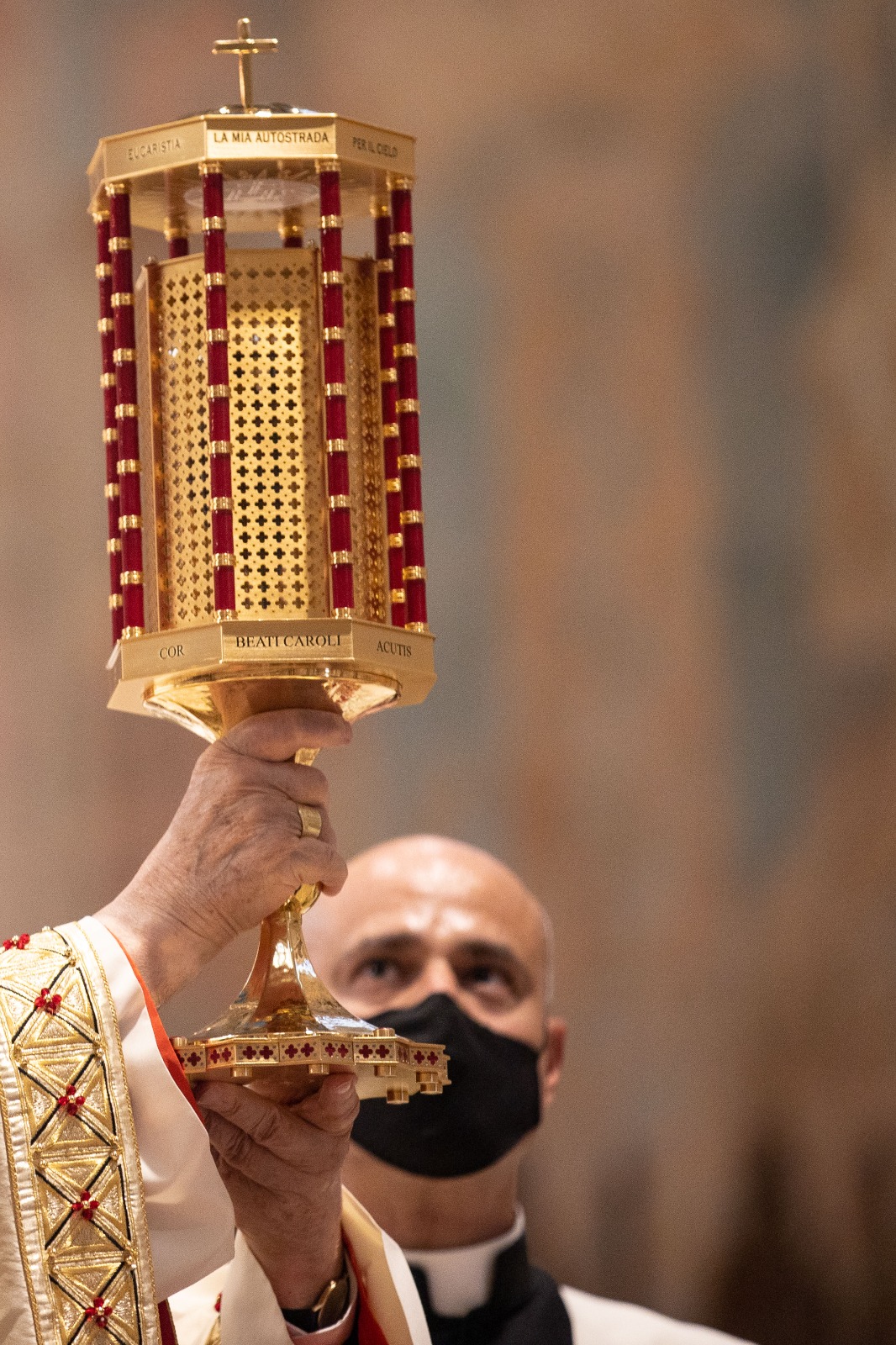 El relicario que contiene el corazón del Beato Carlo Acutis lleva inscripta en la parte superios la frase “Eucaristia la mia autostrada per il cielo”, que significa “La Eucaristía es mi autopista para el cielo“.