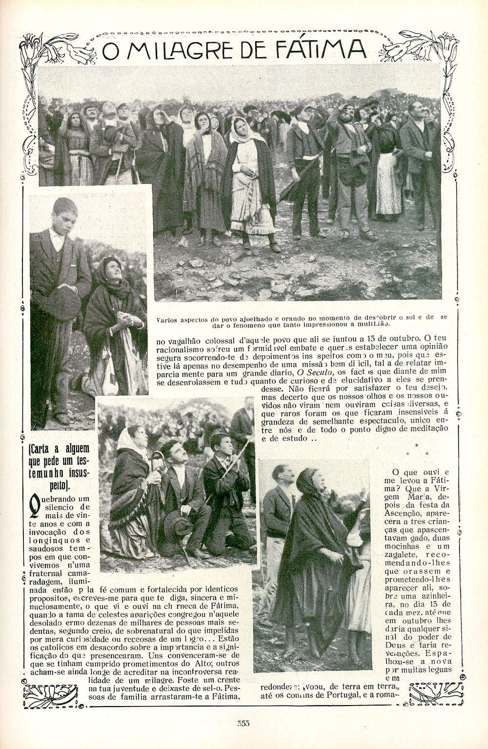 “La historia de esta foto falsa comenzó con la publicación, el 17 de noviembre de 1951, en L’Osservatore Romano, de una fotografía supuestamente tomada durante el ‘Milagro del Sol’ en Fátima, Portugal, el sábado 13 de octubre de 1917, al mediodía (12:30 p. m.). L’Osservatore Romano es el periódico oficial del Vaticano. En realidad, como indicó Voz de Fátima el 13 de junio de 1952 (p. 2), la foto publicada forma parte de una imagen mayor tomada por Alfredo J. Mendonça durante una peregrinación el 13 de mayo de 1921, entre las 6:50 y las 6:58, cerca de la Capilla de Nuestra Señora de Lourdes, en Torres Novas, Outeiro Grande (a unos 16 km de la Cova da Iria, Fátima)”.