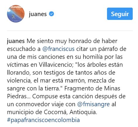 La reacción de Juanes no se hizo esperar y usó su cuenta de Instagram para agradecer al Papa de este modo: