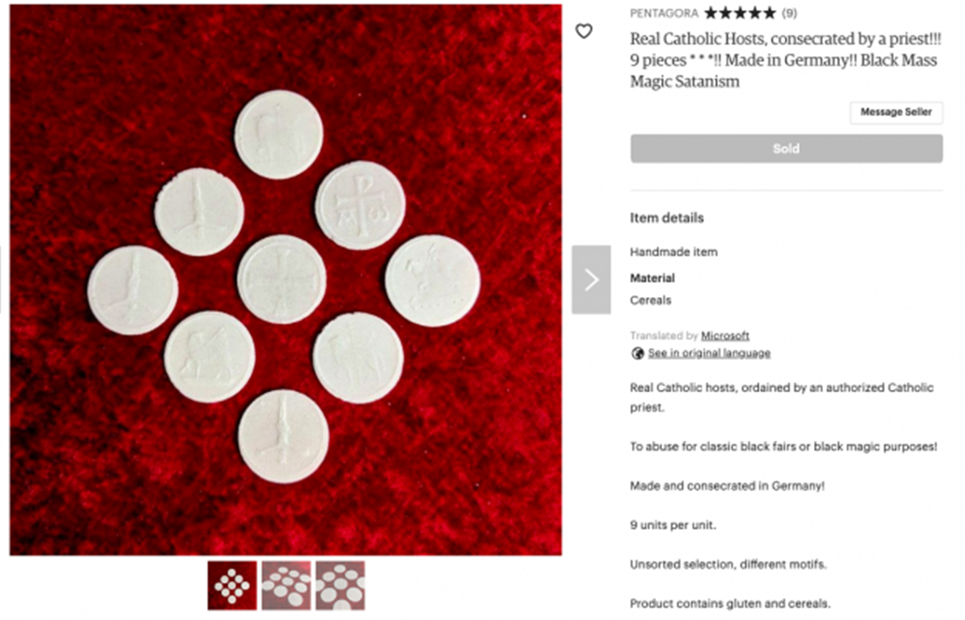 “Hostias reales católicas, consagradas por un sacerdote católico autorizado. / ¡Para profanarlas en clásica misa negra o para propósitos de magia negra!/ ¡Hechas y consagradas en Alemania! / 9 unidades por cada una./ Selección al azar, con diferentes diseños / El producto contiene gluten y cereales”.