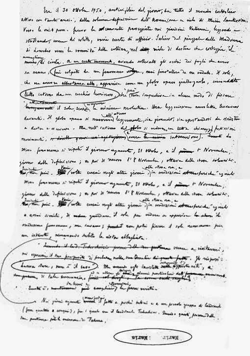 “Era el 30 de octubre de 1950, la víspera del día tan esperado por todo el mundo católico, la solemne definición de la asunción al cielo de María Santísima. Alrededor de las 4 de la tarde, en el habitual paseo por los jardines del Vaticano, leyendo y estudiando, como de costumbre, varios documentos de oficina. Subía desde la plaza de Nuestra Señora de Lourdes hacia la cima del cerro, por la avenida de la derecha que bordea el muro alrededor de la muralla. En un momento dado, al levantar los ojos de las hojas que tenía en las manos, me golpeó un fenómeno que nunca antes había visto. El Sol, todavía bastante alto, aparecía como un globo opaco y amarillento, rodeado todo alrededor por un círculo luminoso que, sin embargo, no le impedía fijar la mirada sin sentir el menor malestar. Una nube muy ligera estaba frente a él. El globo opaco se movió ligeramente hacia afuera, girando y moviéndose de izquierda a derecha y viceversa. Pero dentro del mundo se podían ver movimientos muy fuertes muy claramente y sin interrupción.