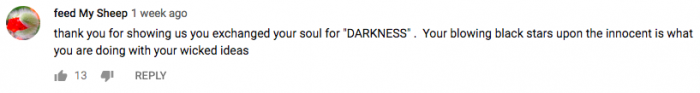“Gracias por mostrarnos que vendes tu alma por ‘OSCURIDAD’. Así como soplas estrellas negras en los inocentes, así los haces también con tus ideas malvadas”.