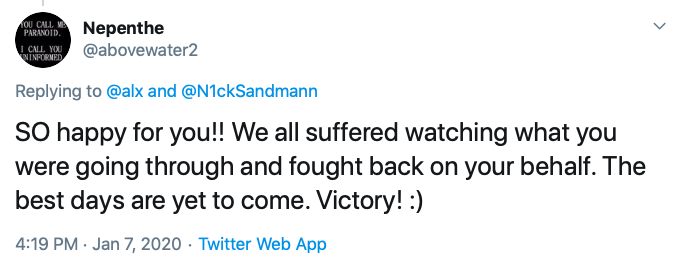 Este usuario dijo: “¡Muy feliz por ti! Todos sufrimos viendo lo que estaba pasando y luchamos en su nombre. Los mejores días están por venir. ¡Victoria! :) ”