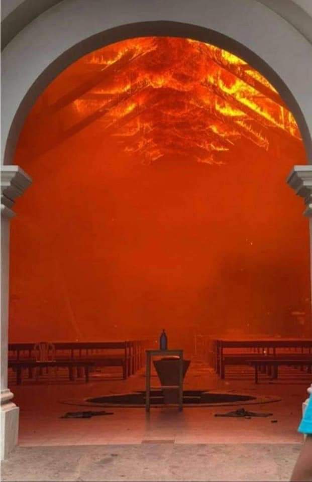 Esto es en lo que creemos los Católicos, la Sagrada Forma no sufrió ningún daño del incendio, y su Majestad el Santísimo Sacramento fue llevado al Templo El Calvario para su adoración.