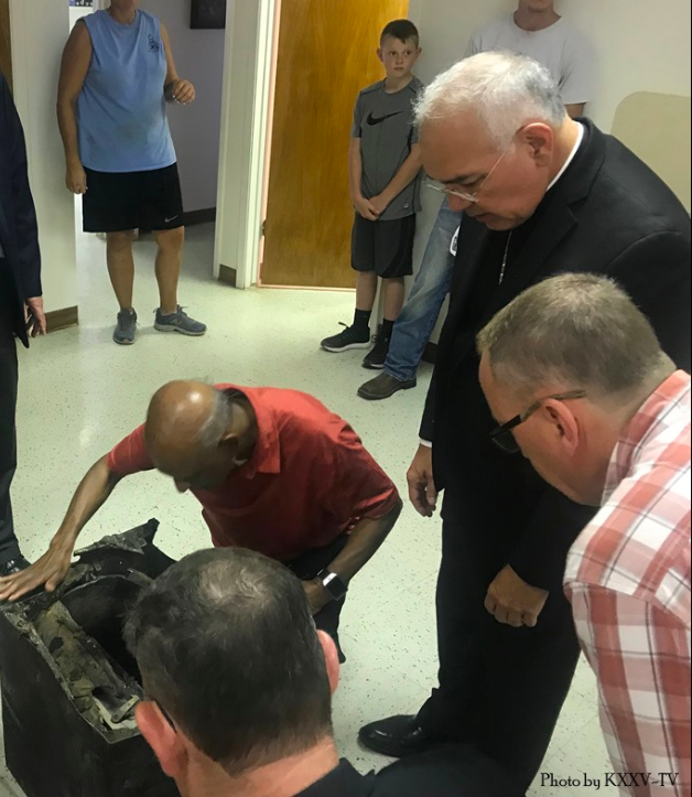 Aquí hay fotos del tabernáculo guardado:El día del incendio, la Diócesis de Austin informó en Facebook que “el obispo Joe Vásquez y el padre Edwin Kagoo, párroco de la iglesia en cuestión, inspeccionaron el tabernáculo, que fue retirado de los escombros del incendio de la iglesia.