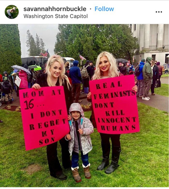“Mamá a los 16 años, yo no me arrepiento de mi hijo” / “Las feministas reales no matan humanos inocentes”.