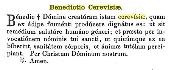 Bendice, Señor, esta cerveza criatura, que te has dignado a producir con el mejor grano: que sea un remedio saludable para la raza humana y concede por la invocación de tu Santo Nombre que quien beba de ella pueda obtener la salud del cuerpo y la paz del alma. Por Cristo, nuestro Señor.