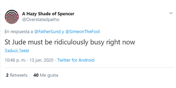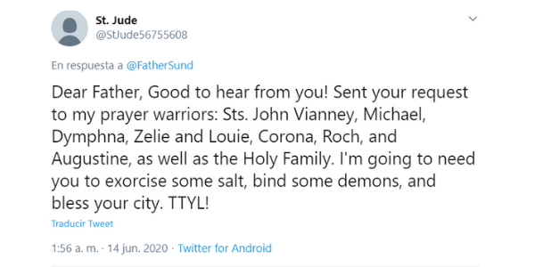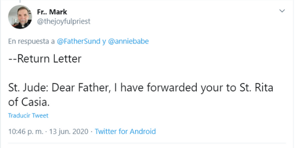 I have forwarded your letter to St. Jude— TechyPriest – Fr. Sund (@FatherSund) June 13, 2020