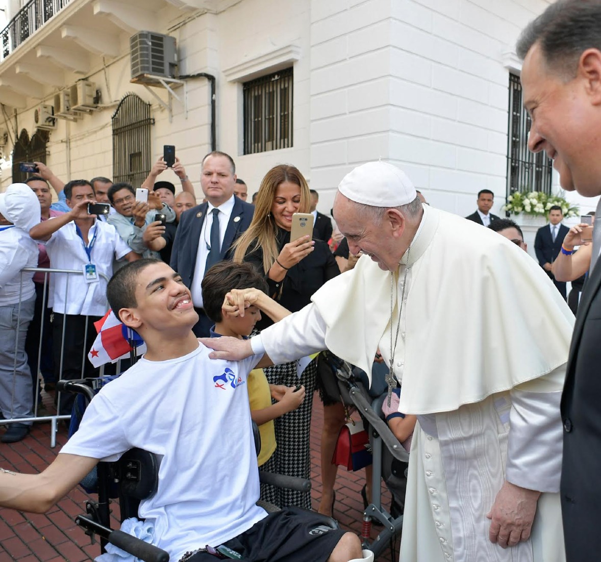 Vatican Media. Papa Francisco saluda a joven peregrino durante su visita al presidente panameño Juan Carlos Valera