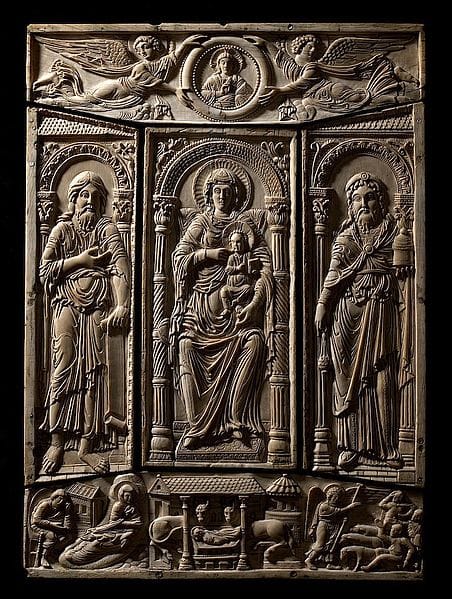 Esta es una cubierta de marfil encontrada sobre una copia de los Evangelios hecha en Alemania a fines del siglo VIII y principios del siglo IX.