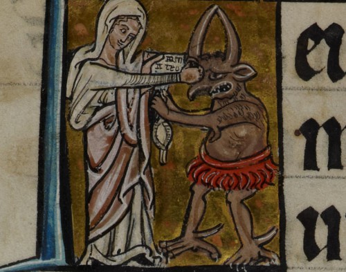Precisamente en uno de ellos, también conocido como “The De Brailes Hours”, aparece la curiosa imagen de la Santísima Virgen golpeando al demonio.