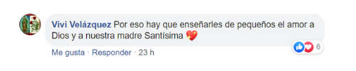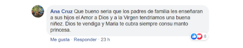 “Qué bueno sería que los padres de familia les enseñaran a sus hijos el Amor a Dios y a la Virgen, tendríamos una buena niñez. Dios te bendiga y María te cubra siempre con su manto princesa”, comenta emocionada una usuaria.