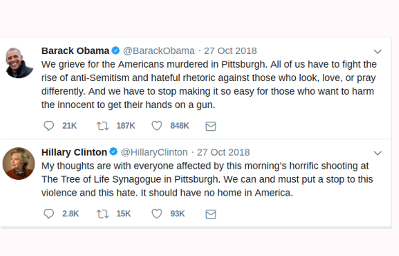 Hillary Clinton: ‘Mis pensamientos están con todos los afectados por el horroroso tiroteo de esta mañana en la sinagoga The Tree of Life en Pittsburgh. Podemos, y debemos, poner un alto a esta violencia y odio; que no debería tener cabida en América [Estados Unidos]’”.