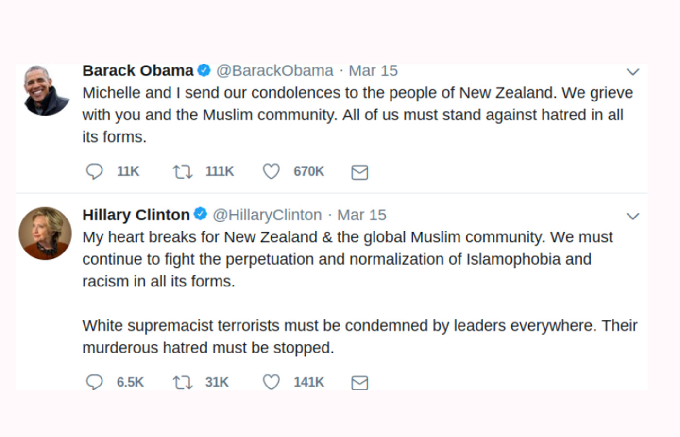 “Barack Obama: ‘Michelle y yo mandamos nuestras condolencias al pueblo de Nueva Zelanda. Hacemos duelo con ustedes y la comunidad musulmana. Todos debemos ir en contra del odio en todas sus formas’.