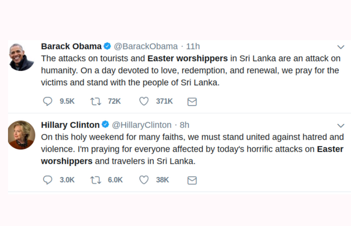 Hillary Clinton: ‘En esta Semana Santa para muchas religiones, debemos mantenernos unidos contra el odio y la violencia. Oro por todos los afectados por los recientes horrorosos ataques contra los adoradores pascuales y viajeros en Sri Lanka’”.
