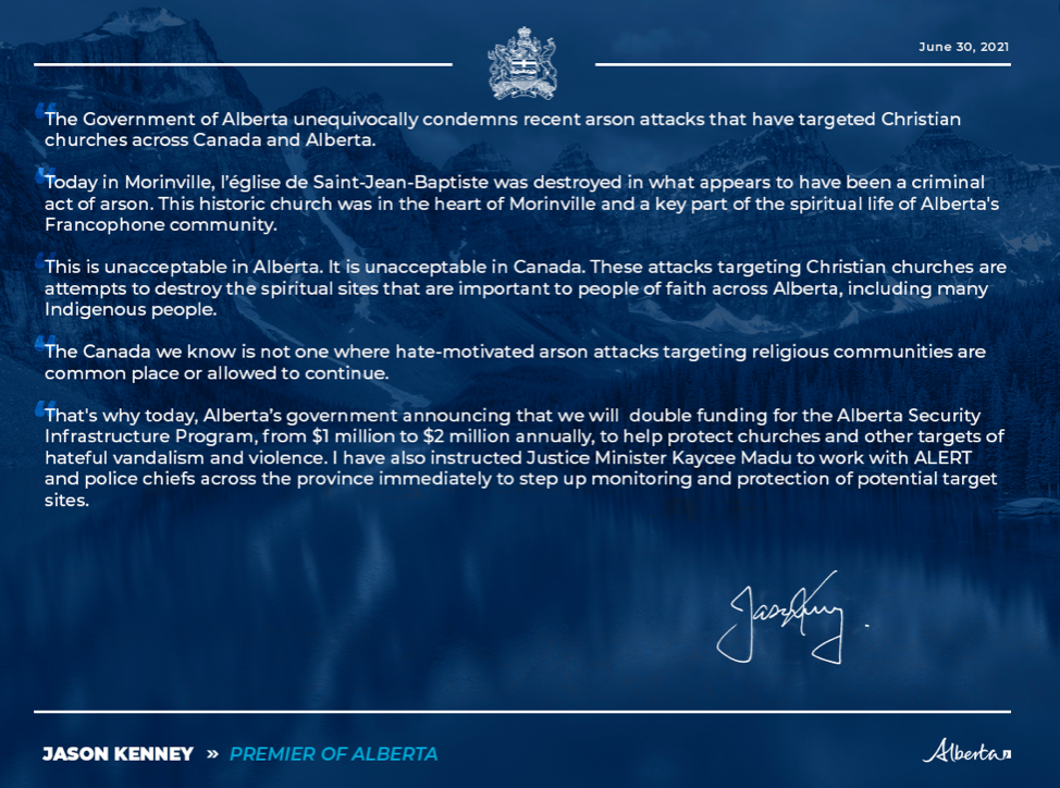 El primer ministro de Alberta (Canadá), Jason Kenney, “condenó” lo que él cree que es un “crimen de odio” contra los católicos.