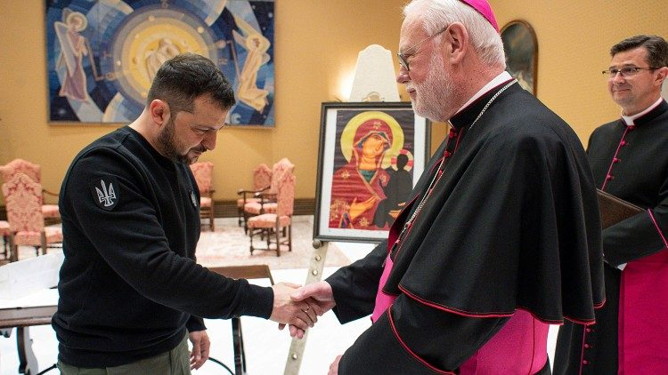 El Papa Francisco le entregó al presidente Zelensky una escultura de bronce que representa una rama de olivo, símbolo de paz. Además, el Santo Padre le regaló el Documento de 2019 sobre la fraternidad humana para la paz mundial y la convivencia, escrito por el Papa y el Gran Imán de Al-Ahzar, Ahmad Al-Tayyeb; un libro sobre la Statio Orbis del 27 de marzo de 2020 y un volumen titulado “Una encíclica sobre la paz en Ucrania”.