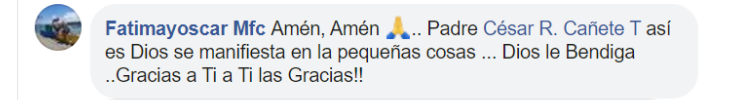 “Amén, Amén Padre César R. Cañete T así es Dios se manifiesta en la pequeñas cosas… Dios le Bendiga.. Gracias a Ti a Ti las Gracias!!”, comenta otra usuaria profundamente agradecida con el sacerdote.