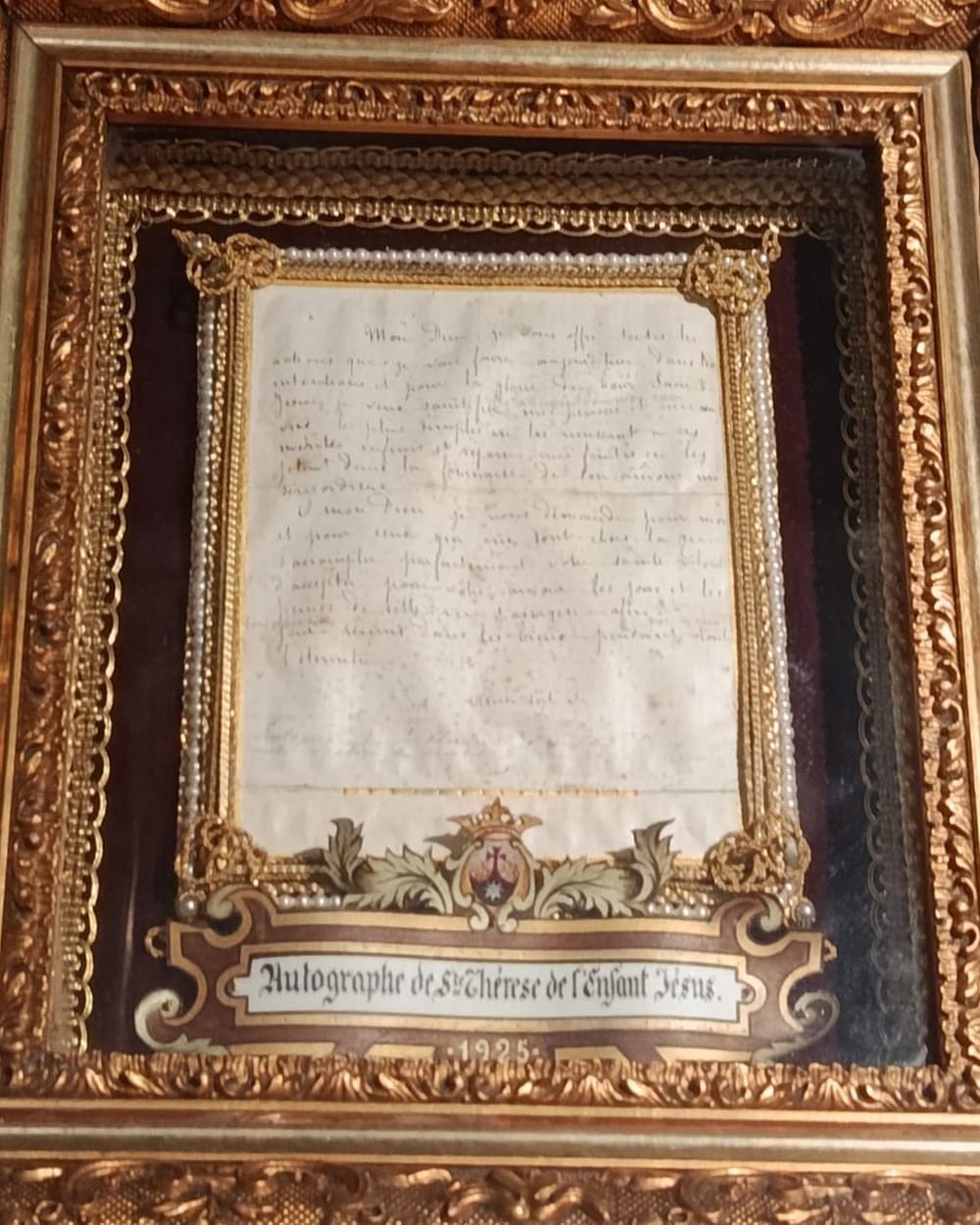 “Contiene el hueso del talón y el metatarso de Santa Teresita. La sacamos de Escocia por primera vez, especialmente para Knock”, dice el video. “Es una reliquia sumamente importante que fue entregada al canónigo Taylor, fundador de la Gruta de Carfin, por la Madre Inés —quien era Pauline, la hermana de Santa Teresita”.