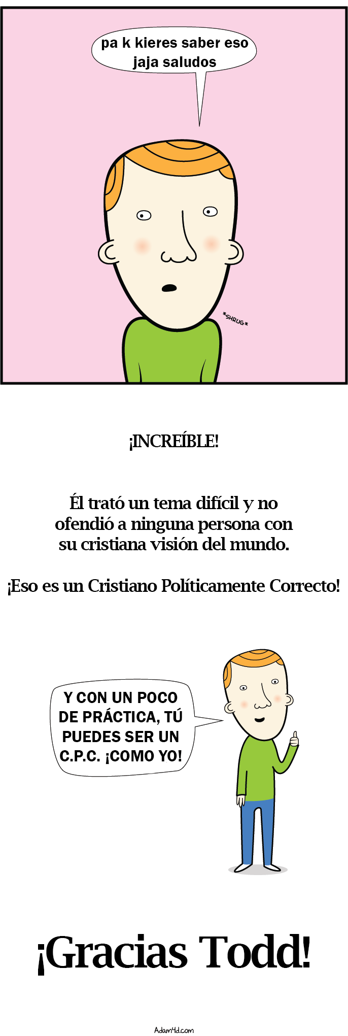 CómicsVida cristiana Sé un Cristiano Políticamente Correcto con este simple truco Editor de ChurchPOP 4 de abril de 2016 — 1 minuto Comparte El link fue copiado adam4d.com Comic de Adam4d.com [Ver: Después de meter todo el equipaje del Papa Francisco en la limusina…] [Ver: VIDEO: ¿Jesús está muerto? La divertida respuesta de Cantinflas] Comparte El link fue copiado