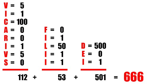 - Si esta lógica sería correcta, la suma aún estaría mal hecha. Si prestamos atención a la palabra VICARIVS. Todo el mundo sabe que IV es 4; por lo tanto la suma correcta sería 664 y no 666.