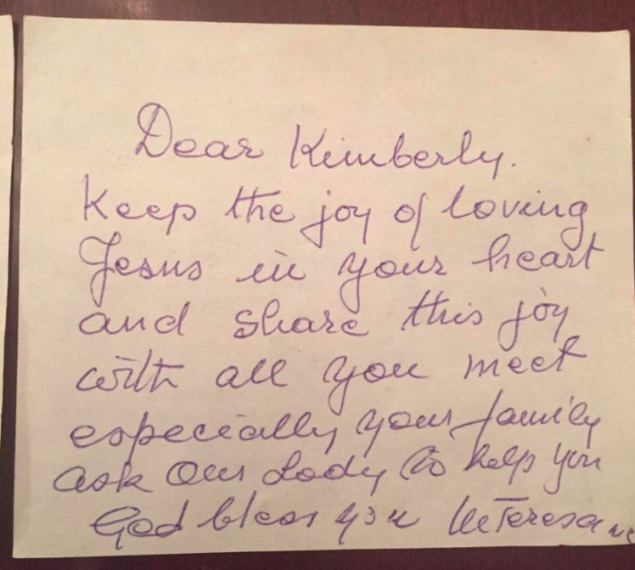 Nota 1: ‘Querida Kimberly, mantén la alegría de amar a Jesús en tu corazón, y comparte esta alegría con todo lo que conozcas, especialmente c tu familia. Pídele a Nuestra Señora que te ayude. Dios te bendiga, M. Teresa, M. C.’.