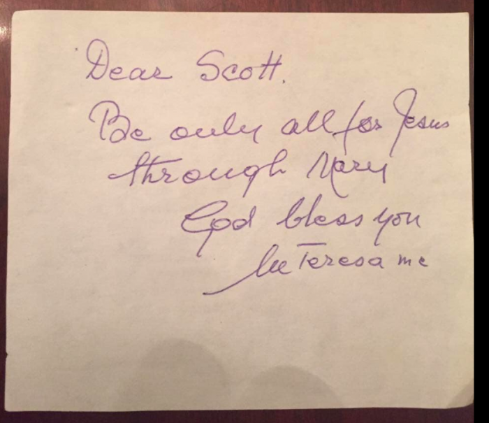 Nota 2: ‘Querido Scott, sé sólo todo por Jesús, a través de María. Dios te bendiga. M. Teresa, M. C’“