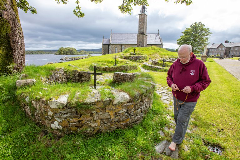 Aunque no llegan peregrinos a la isla, cada mañana, el padre sale Laurence Flynn , se quita las sandalias, y vuelve a emprender con los pies descalzos el camino de la peregrinación recorrido por millones de personas en los últimos 150 años.