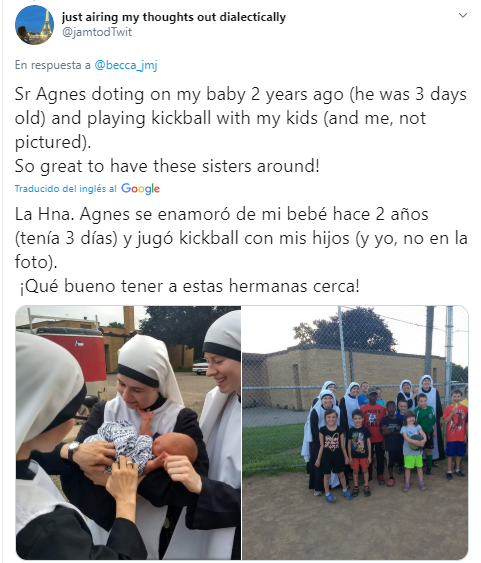 Otra usuaria comenta: “La Hna. Inés se enamoró de mi bebé hace 2 años (tenía 3 días) y jugó kickball con mis hijos (y yo, no en la foto). ¡Qué bueno tener a estas hermanas cerca!”.
