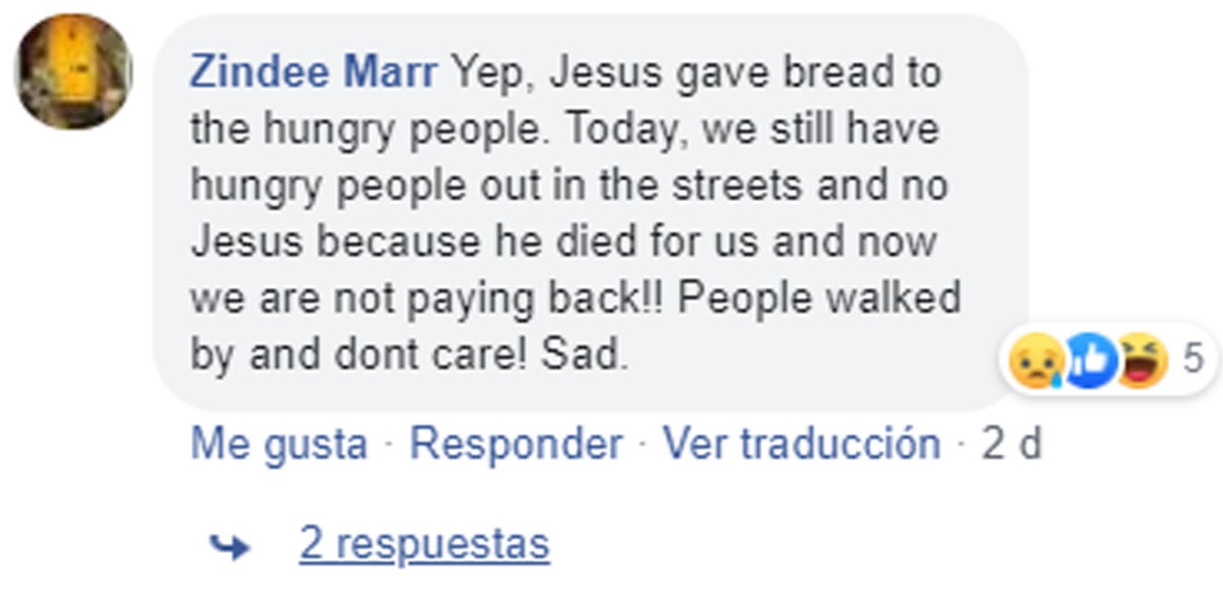 “Sip, Jesús dio pan al hambriento. Hoy, aún tenemos personas con hambre en las calles y no está Jesús porque murió por nosotros, ¡y no estamos haciendo nada al respecto! ¡Le gente solo pasa de largo y no les importa! Triste”.
