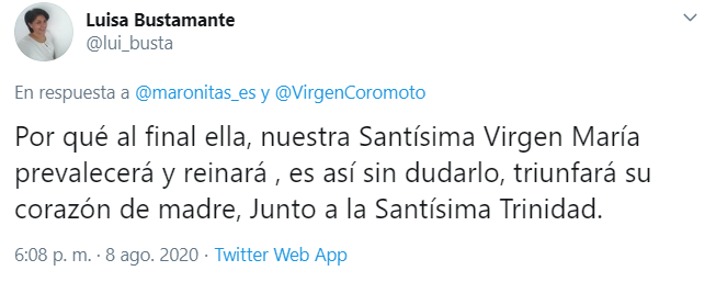 Otra usuaria observó: “Por qué al final ella, nuestra Santísima Virgen María prevalecerá y reinará , es así sin dudarlo, triunfará su corazón de madre, Junto a la Santísima Trinidad“.