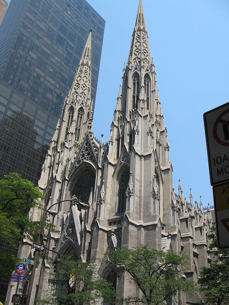 Directamente al otro lado de la calle del Rockefeller Center en el medio de la ciudad de Nueva York, la Catedral de San Patricio se construyó en el siglo XIX cuando el centro de la ciudad no estaba tan poblado y su gran tamaño dominaba el área. La construcción comenzó en 1858, se detuvo durante la Guerra Civil y se terminó en 1878. Se realizaron más trabajos a principios del siglo XX, y fue nombrado Sitio Histórico Nacional en 1976. Actualmente se utiliza como sede del arzobispo católico de Nueva York.