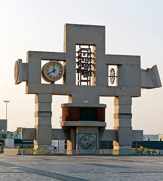 En el atrio de la basílica de Guadalupe, se puede apreciar el carrillón, una estructura de 23 metros de altura, que cuenta con 48 campanas.